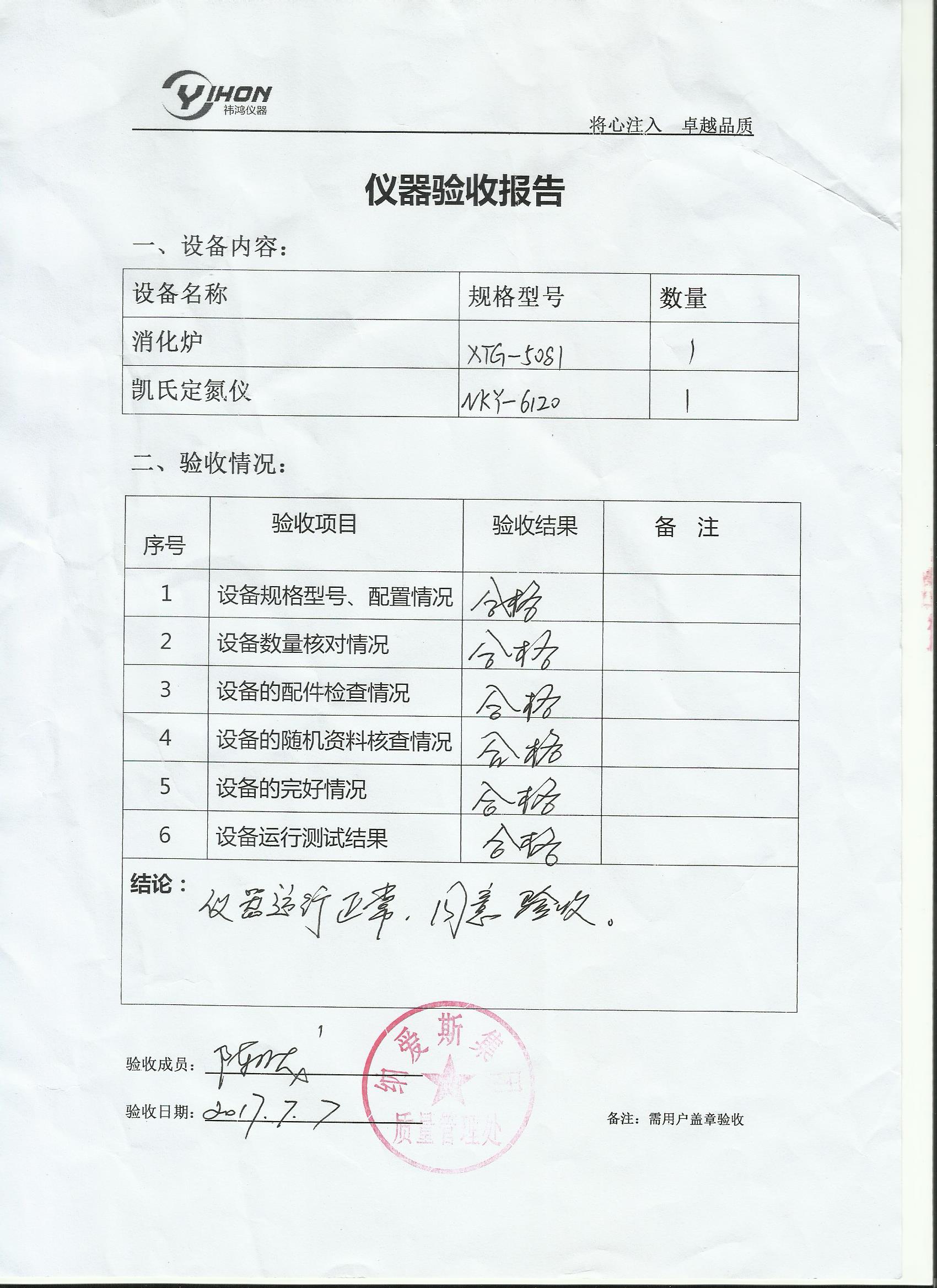 全自動凱氏定氮儀 紅外消解儀 設(shè)備驗(yàn)收報告
