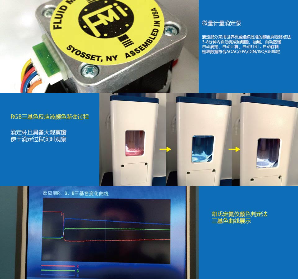 三、消解結(jié)束進(jìn)入蒸餾滴定階段(NKY6120全自動凱氏定氮儀,采用的是邊蒸餾邊滴定同時進(jìn)行的,終點(diǎn)顏色判定法)